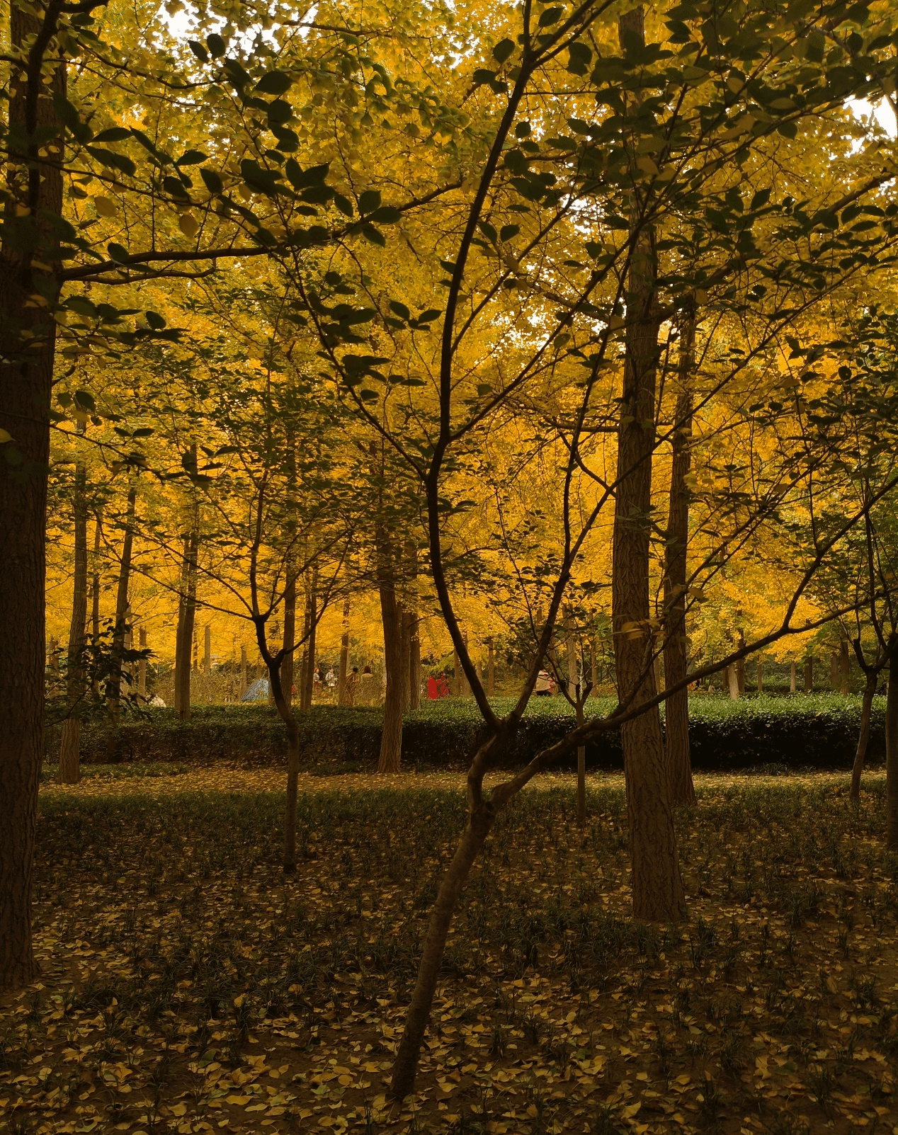 背景中,光线透过树叶的缝隙洒下,营造出一种温暖而柔和的氛围。整个画面充满了自然的和谐之美,仿佛时间在这一刻静止,让人沉浸在这静谧的校园秋景之中。