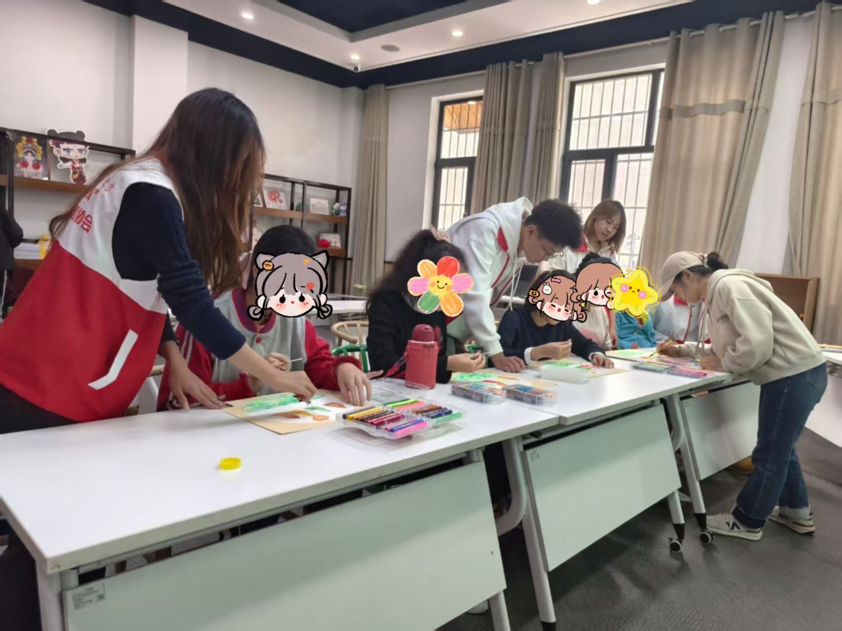 活动开始前,志愿者们提前布置场地,精心准备了画纸、彩笔等绘画材料,并制作了“晒”“被”“子”等主题字样。孩子们陆续到场后,志愿者以亲切的语言引导他们熟悉绘画工具、放松心情,迅速拉近了彼此的距离。绘画环节中,孩子们在志愿者的陪伴下自由发挥想象力,用画笔描绘出心中“晒被子”的生动画面。志愿者们始终以耐心和鼓励支持每一位孩子,真诚肯定他们的每一笔表达,现场气氛温馨而融洽。