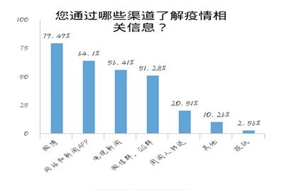同学们对疫情的关注度很高,其中82%的人会每天通过微博、新闻、网站和各种社交平台关注疫情的最新状态变化。近98%的同学的居住地采取了措施,阻止外来人员进入,大多数同学也能积极响应国家号召,安心待在家里,认真学习。但调查中有一项数据偏低,只有74%的人了解新冠肺炎的主要传播途径,希望同学们都认真了解新冠病毒,并采取有效的预防措施,不要相信谣言,放松心态,不要产生焦虑心理。国家还没有度过危机,这是一场没有硝烟的战争,我们依旧不能放松,戴口罩、勤洗手、少出门,提高防范意识,不能辜负一线人员的努力,在家里也要努力学习,用自己的方式支持防疫工作。