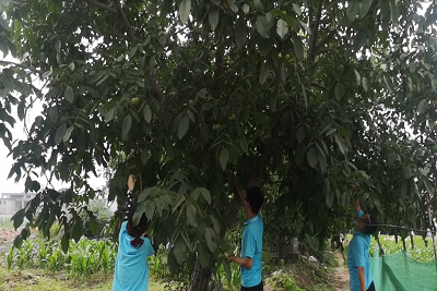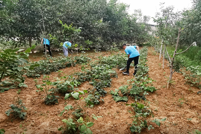 在志愿执勤的过程中,队伍成员了解到,现正到了核桃和桃子成熟的季节,部分农民要前去采摘作物销售。在前来办理新生儿手续的人群中,队伍成员发现了一位年迈的老人带领重孙前来办理。仔细询问才得知,老人已年过七旬,儿子儿媳妇不幸死于煤气中毒,自己和孙子相依为命。孙子成家立业之后和孙媳妇进城打工,由她一人照料孩子,眼看到了采摘桃子和核桃的季节,自己却因为年迈和照看重孙无法完成采摘。因此,团队成员主动提出下午帮助老人进行作物采摘和除草的任务。顶着酷暑,团队成员不辞辛劳,深入田间地头,有的采摘桃子,有的帮助摘核桃,有的清理田内杂草。团队成员坚持义务劳动,他们的无私付出赢得了老人的赞誉和感谢。