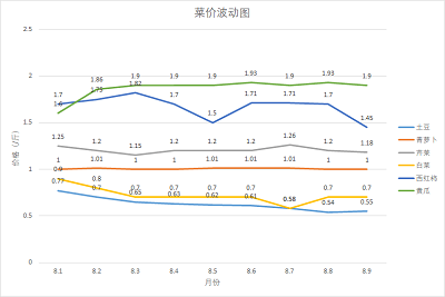 调查活动期间,服务队成员每天到便民超市、车行、电力公司等地进行一次物价统计,并将统计数据分类为农产品、纺织服装、房产、车辆、日用品、通讯设备、电力及医疗等方面。服务队成员将统计数据绘制成折线图,以将调查数据的变动进行直观反映。在调查中,服务队成员着重调查了与人民生活息息相关的生活物资价格变动情况。其中,以蔬菜类作为主要调查对象,在对蔬菜类进行具体细分后,成员们分别调查了土豆、青萝卜、芹菜、白菜、西红柿、黄瓜等常见蔬菜的价格。服务队成员还通过房产中介对近三个月济南市市中区房价进行调查,并取得了大体价位变动数据。