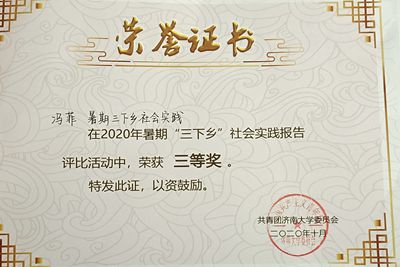 我院2019级学生冯菲在各个环节中表现优异,最终获得此荣誉。在学习上,她自入学以来努力学习,并积极参加“挑战杯”大学生课外学术科技竞赛。在2019-2020学年荣获一等奖学金;在2020年秋荣获了“优秀学生”。