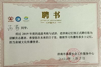 她积极参与校外活动,经过2019年度的选拔考核与试讲,被老济南记忆馆正式聘任为志愿讲解员,努力学习传播传承乡土记忆,担当泉城文化传播使者。