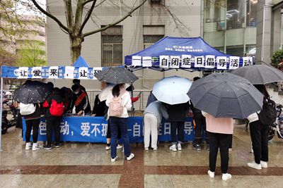 早上八时许,志愿者们携带物资到达八食广场,提前布置好场地。上午九时,活动正式开始。志愿者们肩披绶带,为前来参与活动的同学系上蓝丝带,倡导同学们加入蓝色行动,用击掌表达对自闭症群体的支持,在蓝色横幅上签名。为了呼吁更多的同学参加活动,志愿者身穿熊玩偶头套,向来往的同学分发宣传单,使更多的同学能够了解自闭症患者群体。活动于下午六时结束,共有42名志愿者参与。
