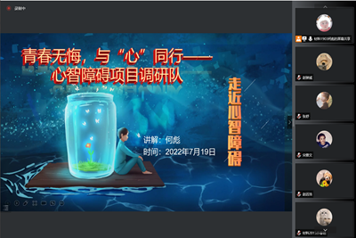 为保障团队实践活动正常进行,加强团队成员对实践活动的了解,7月19日,williamhill英国中文青春无悔,与“心”同行——心智障碍项目调研队开展了“走近心智障碍”主题培训会,本次培训会由团队队长何彪主讲,团队全体成员参与。