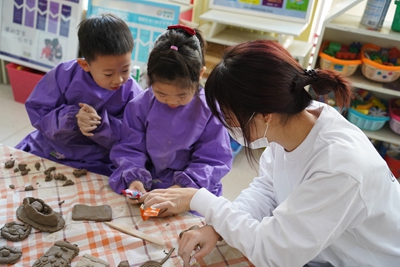 活动准备阶段,小朋友在老师的帮助下更换服装,有序入座。活动开始,志愿者向小朋友们介绍制陶工具的安全事宜和使用方法,由志愿者给小朋友们分发陶泥。小朋友们分成两组分别完成陶艺创作,一名志愿者负责一到两名小朋友,帮助指导小朋友们完成其创作。创作过程中,小朋友的想法接连不断地涌出,通过双手表达奇思妙想,锻炼了他们的动手制作能力,提高了小朋友们的表达能力。活动过程中,志愿者和小朋友们沟通互动,经过一小时的努力,小朋友们成功完成了作品。活动最后,小朋友们拿着自己的作品和志愿者们进行合照,挥手告别。在温暖舒适的三月,小朋友们领略到了制陶的魅力,感受到了手工的乐趣,至此活动圆满结束。
