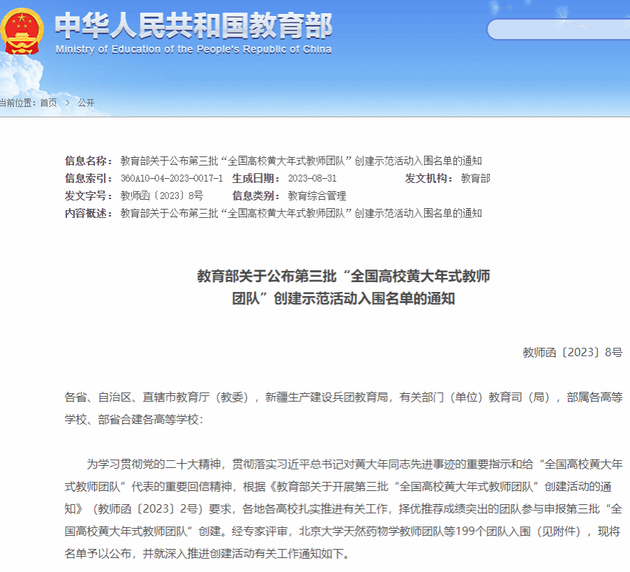 8月31日,教育部公布第三批“全国高校黄大年式教师团队”评选结果。由我院程新教授领衔的先进材料制造及应用教师团队成功入选。全国共有199支教师团队入选。这是继2022年郑庚修教授领衔的绿色化学制造与精准检测教师团队入选第二批“全国高校黄大年式教师团队”以来,我校再次获此殊荣。