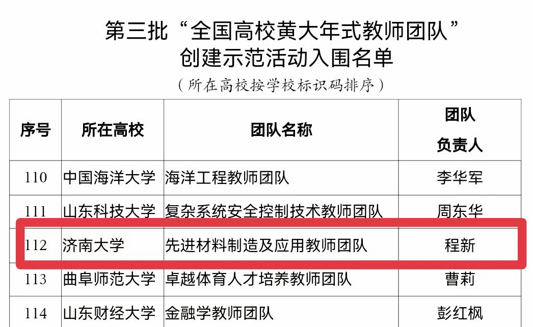 多年来,学校高度重视、扎实推进黄大年式教师团队创建活动,持续推动黄大年精神与教师团队建设深度融合,着力提升教师队伍师德师风、教育教学、科研创新和社会服务水平,培养了一批高水平教师团队,“先进材料制造及应用教师团队”就是我校优秀教师队伍中的杰出代表。今年7月,“先进材料制造及应用教师团队”获第三批“山东省高校黄大年式教师团队”荣誉称号,经省教育厅推荐参选第三批“全国高校黄大年式教师团队”并成功入选。
