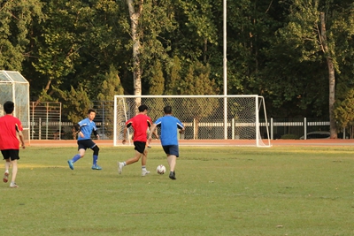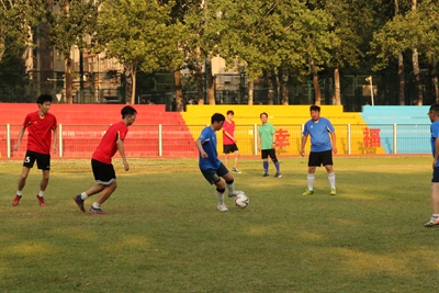 下午四点十六分,师生齐聚北苑操场,在裁判的一声哨响之后,这场令人期待已久的足球赛拉开序幕。双方队员迅速进入状态,球员们雄姿英发,纷纷开启运动模式。上半场比赛,双方队员互不相让,积极传球,默契配合,充分发挥自己的特长,足球在他们的脚下灵活飞舞。下半场比赛,他们依旧以饱满的激情,昂扬的斗志,团结向上的精神投入比赛,老师们排兵布阵,转守为攻,接连进球,赢得一片欢呼喝彩;学生们积极拼抢,稳扎稳打,相互配合做好防守,多次防守成功振奋人心。最终老师们以4:1的比分赢得了本场比赛。随后,老师和学生进行了点球友谊比赛。