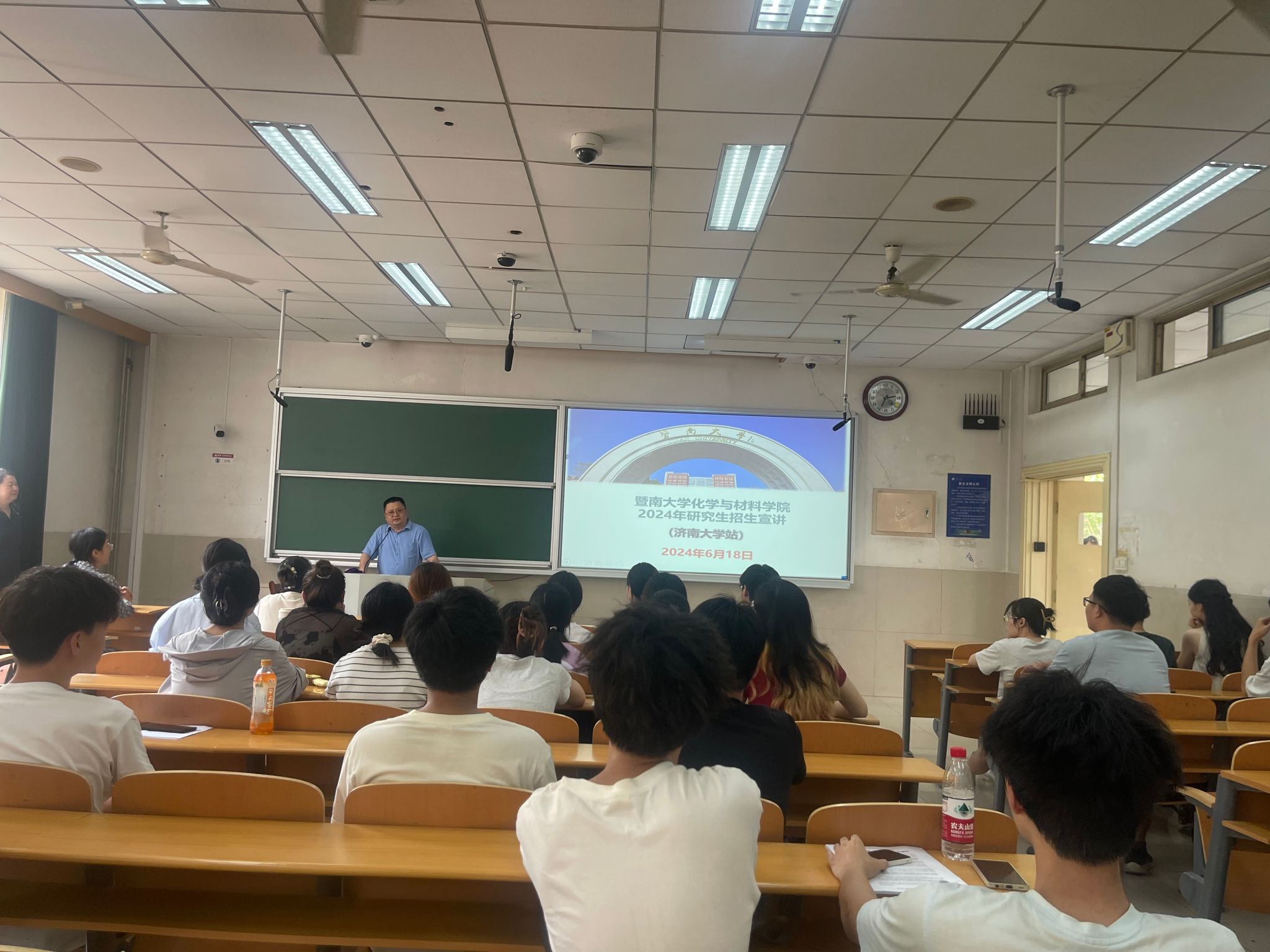 为营造我院优良考研氛围,使同学们更好地了解各高校硕士研究生招生政策,全力保障我院学生考研上岸,促进校际之间先进经验交流共享,6月18日,暨南大学化学与材料学院副院长李红教授一行来我校开展硕士研究生招生宣讲,学院70余名有志于考研深造的学生参加本次宣讲会。宣讲会由副院长段广彬主持。