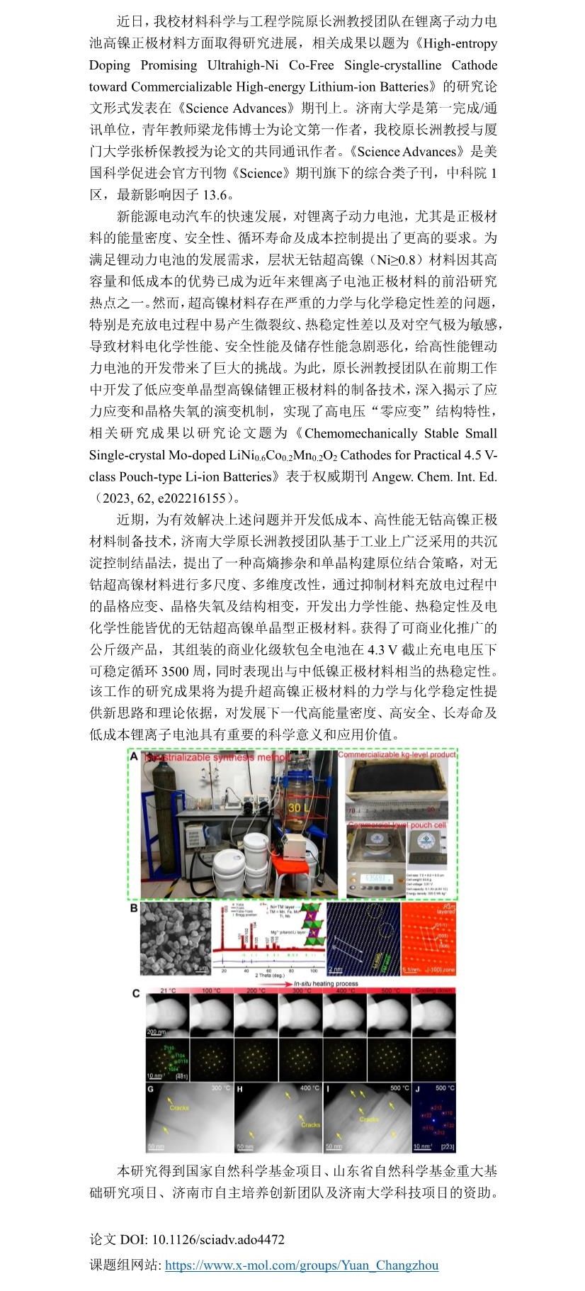 材料学院原长洲团队在《Science Advances》发表锂电高镍无钴正极材料研究成果