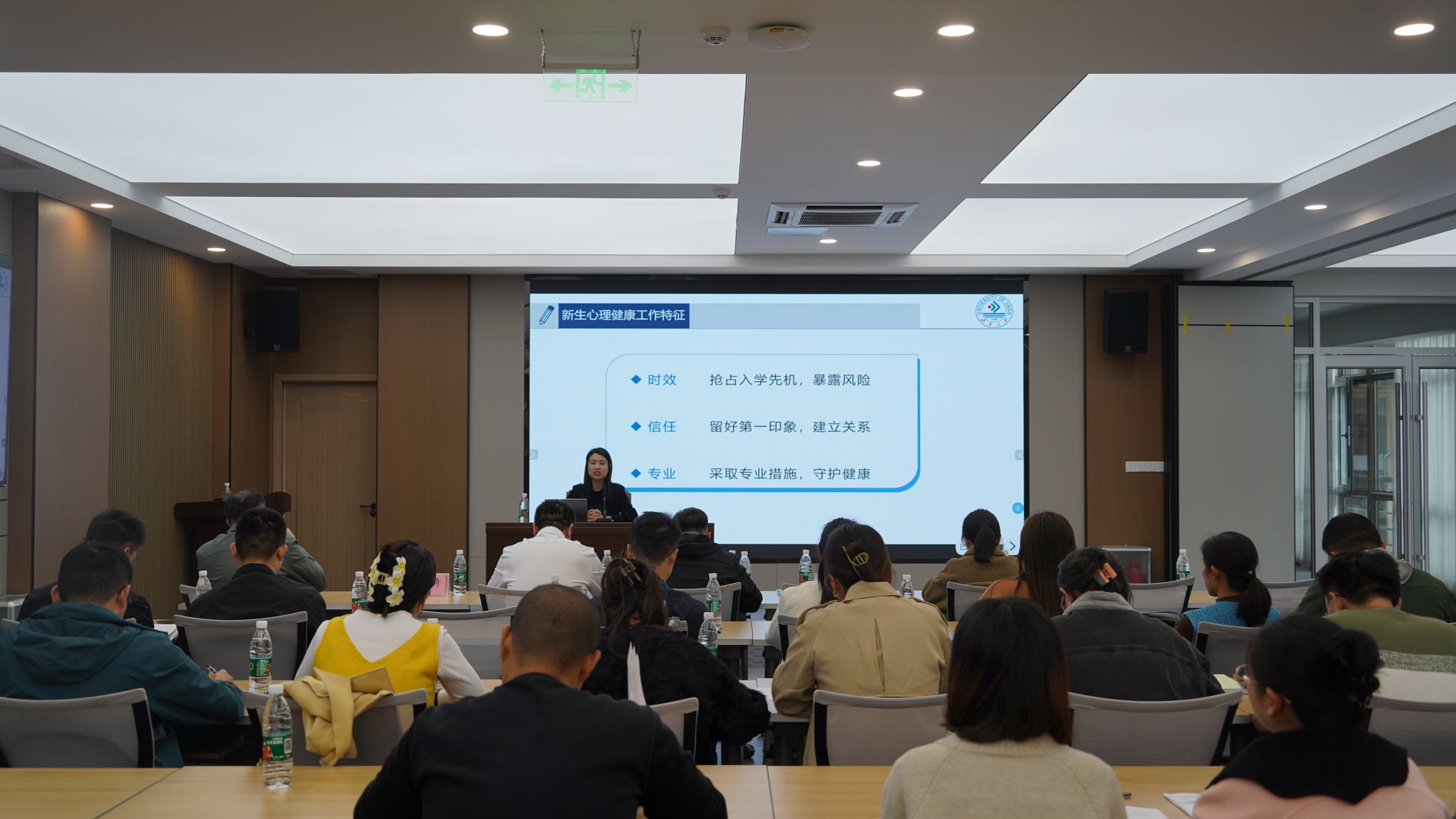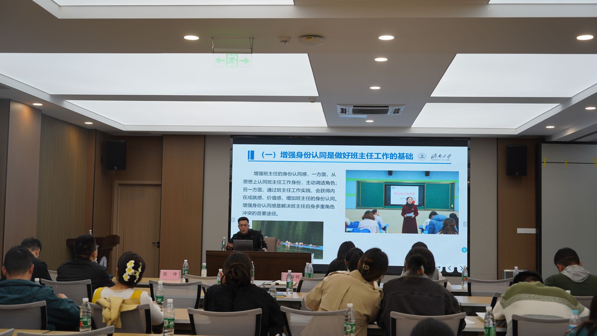 蔺琦琦老师作了题为《心理问题识别信号及途径》的报告,她从心理工作要点、日常工作开展、心理评估要点三个方面展开,通过报告让在场老师对于心理问题的觉察有了科学方法、理性看法,为老师们更好地开展学生心理健康教育提供了丰富、科学的指导。李海明老师作乐题为《高校班主任班级工作中的个人思考》为题做专题报告,他结合学生工作和班主任工作经验解析了班主任工作职责、框架和基本内容,强调担任班主任工作需要具备多方面的条件,包括身份认同、学生本位、强烈的责任感、思想政治引领能力、扎实的专业基础以及持续学习的态度,每个不同学生凝聚而成的班风中都有老师的影子。最后他强调:“引导学生成长是一项艰巨的任务。不仅要关注他们的学业成绩,更要关心他们的身心健康和全面发展。时常与学生谈心谈话,了解他们的困惑和需求,给予他们鼓励和支持。当看到学生们在自己的帮助下逐渐明确人生方向,那种成就感难以言表”。