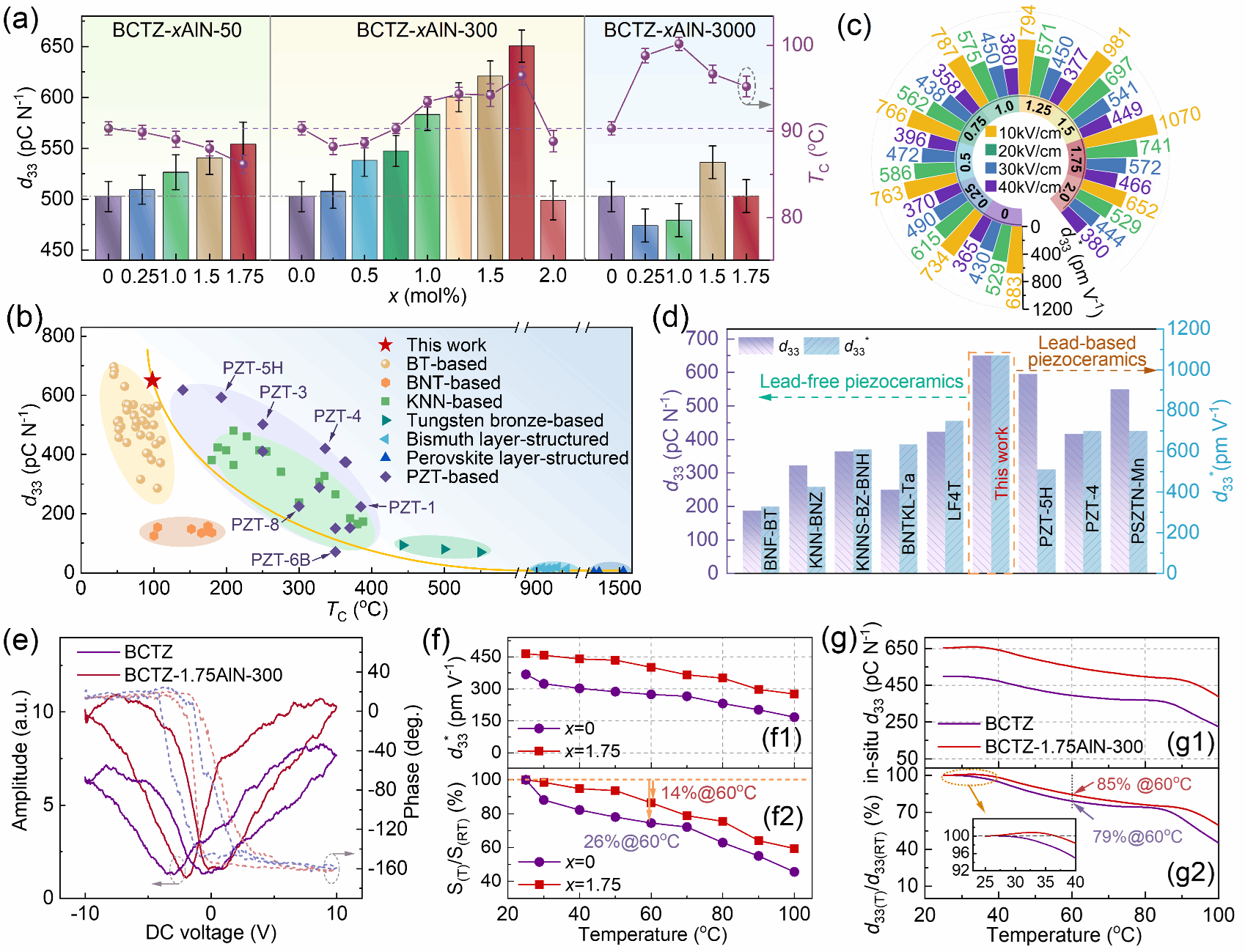 图1 BCTZ-AlN基无铅压电陶瓷的优异压电性能和居里温度