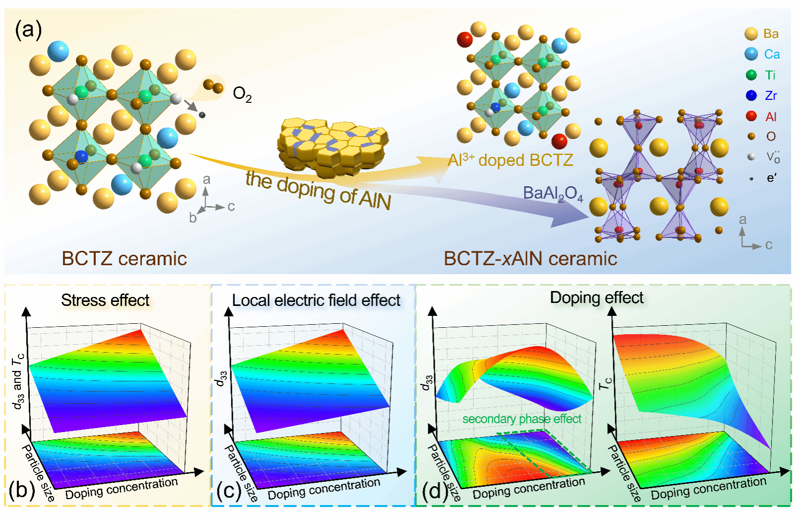 压电材料作为现代智能传感、医疗成像和能源转换等领域的核心材料,长期以来依赖于铅基压电陶瓷。然而,铅元素的高毒性及日益严格的环保法规要求,推动全球科研力量加速探索无铅替代方案。其中,Ba0.85Ca0.15Ti0.9Zr0.1O3(BCTZ)陶瓷因优异的压电响应成为研究热点,但其性能提升面临关键瓶颈——压电系数(d33)与居里温度(TC)难以同步优化。尽管传统方法如烧结工艺优化、元素掺杂等可改善单一参数,却难以突破性能间的此消彼长困境。如何同时提升d33与TC,成为无铅压电材料领域亟待解决的科学难题。