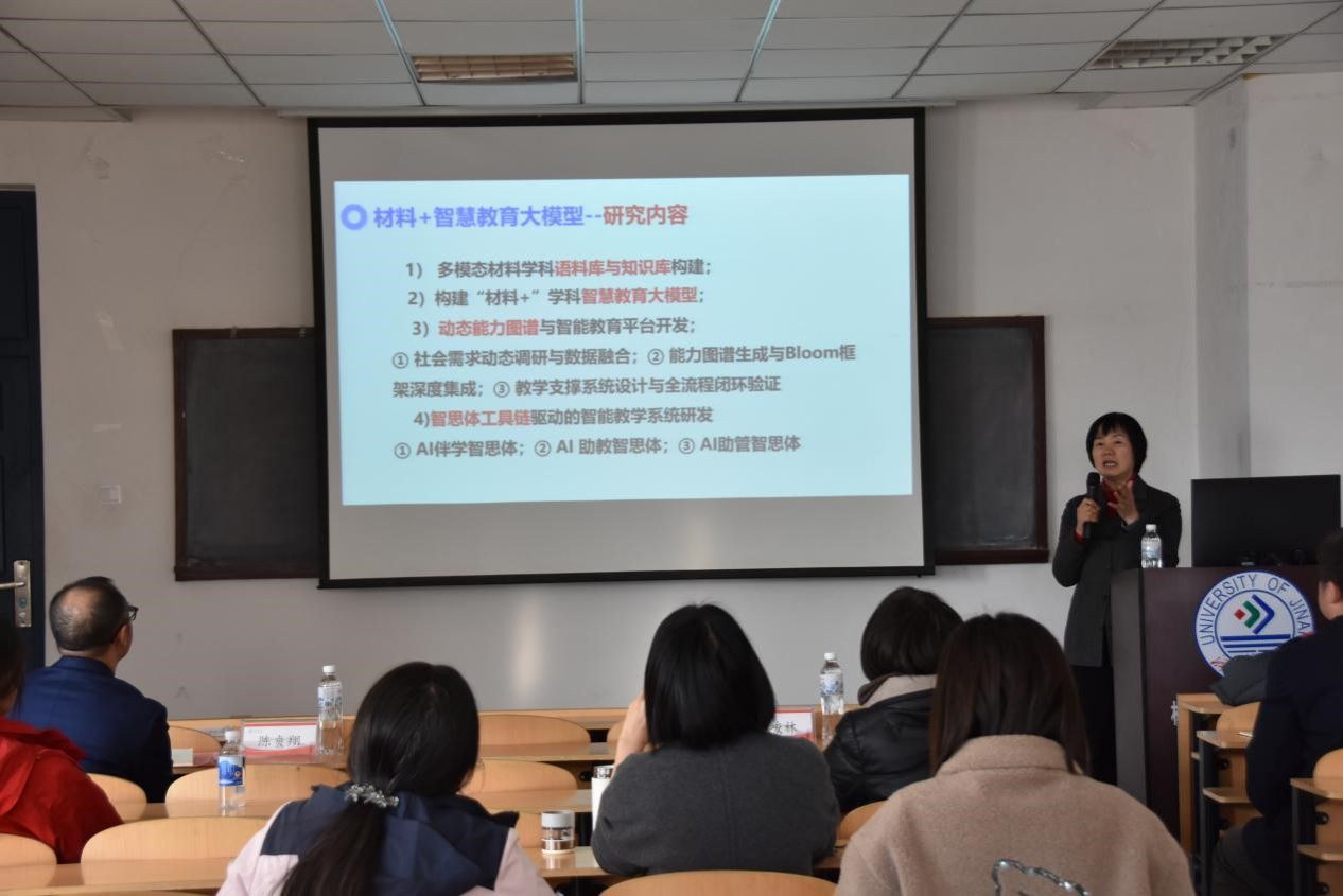 谢峻林教授从教育数字化转型的时代背景出发,系统阐述了“材料+”与“智慧教育大模型”融合发展的战略价值与实践方向。她指出,构建“材料+”智慧教育大模型,既是服务国家材料强国战略的迫切需要,也是推动材料类专业内涵改革与教学范式创新的内在要求。谢教授深入剖析了当前材料领域人才需求发生的深刻变化,面对变革亟须构建以“专业能力图谱”为核心的新型教学体系。她强调,能力图谱能够系统贯通“培养目标-职业能力-毕业要求”,实现社会需求与培养过程的有效对接,为课程体系重构、教学策略优化与形成性评价实施提供科学依据。谢教授还在报告会上分享了项目最新研究进展“材智”教育大模型1.0版,该模型基于多模态材料科学知识库,以“智思体工具链”为驱动,构建了覆盖“AI助教、AI伴学、AI助研、AI助管”的全场景智能教学系统。