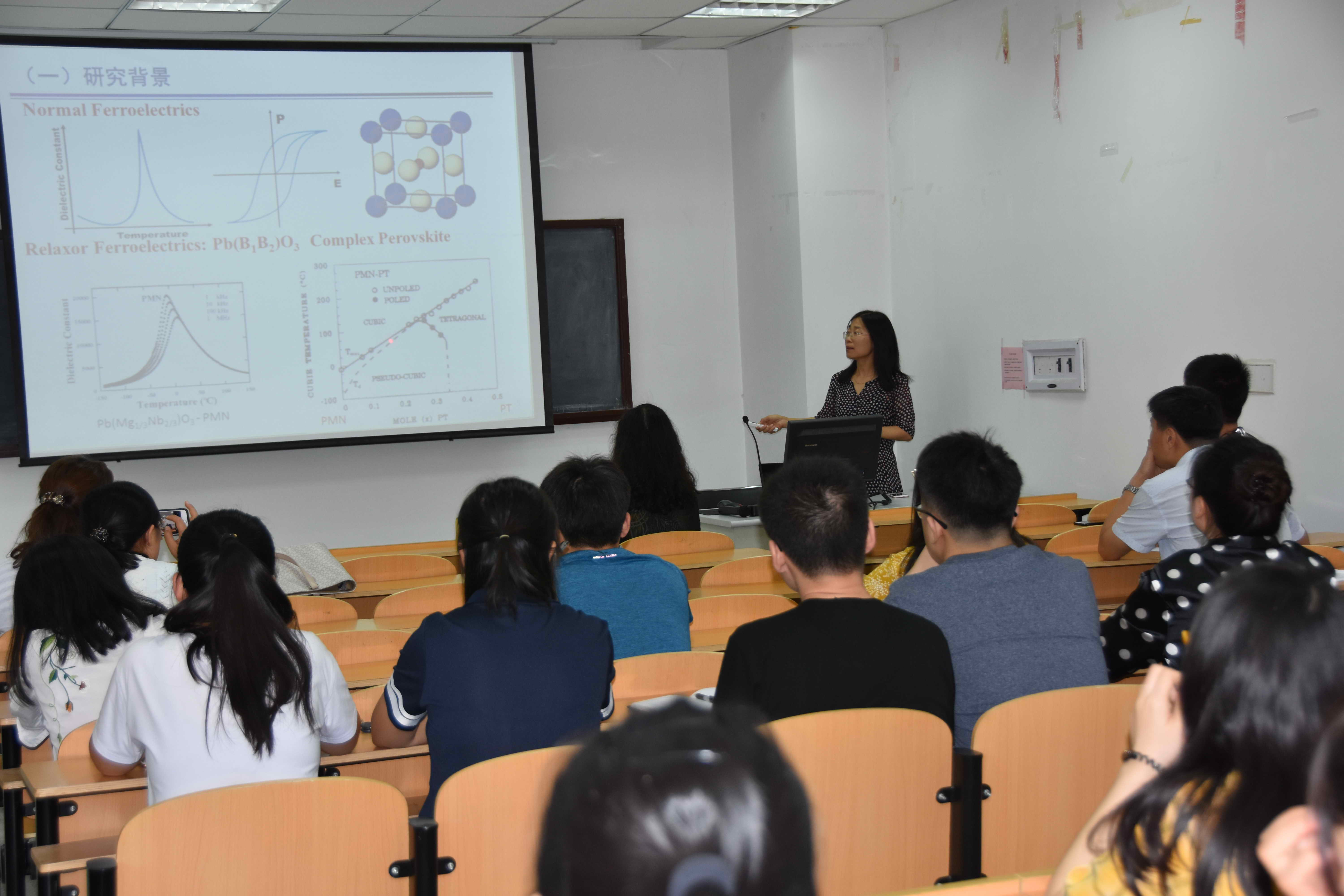 围绕“高性能弛豫铁电单晶及其单晶超声器件的研究”,李教授详细地介绍了弛豫铁电单晶的生长研究、外场作用下弛豫铁电单晶的性能、弛豫铁电单晶畴结构和弛豫铁电单晶超声器件的研制等问题。李教授娓娓道来,既揭示了其中的科学理论,又讲解了器件开发中的关键技术,让大家耳目一新、受益匪浅。
