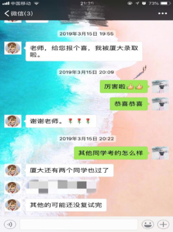 学院“最学霸班级”、材料1508班张哲同学说:“从3月15日分数出来,到一志愿学校面试失败,再到抓住调剂的尾巴,历经三轮,终于成功调剂到一所211院校,一年的努力终究没有白费,道路虽然心酸。但我始终坚信机会总是留给有准备的人,辅导员和班主任一直在帮助我联系调剂,许多学长学姐的也为我加油打气,考研的路上有他们的陪伴,我们并不孤独!”