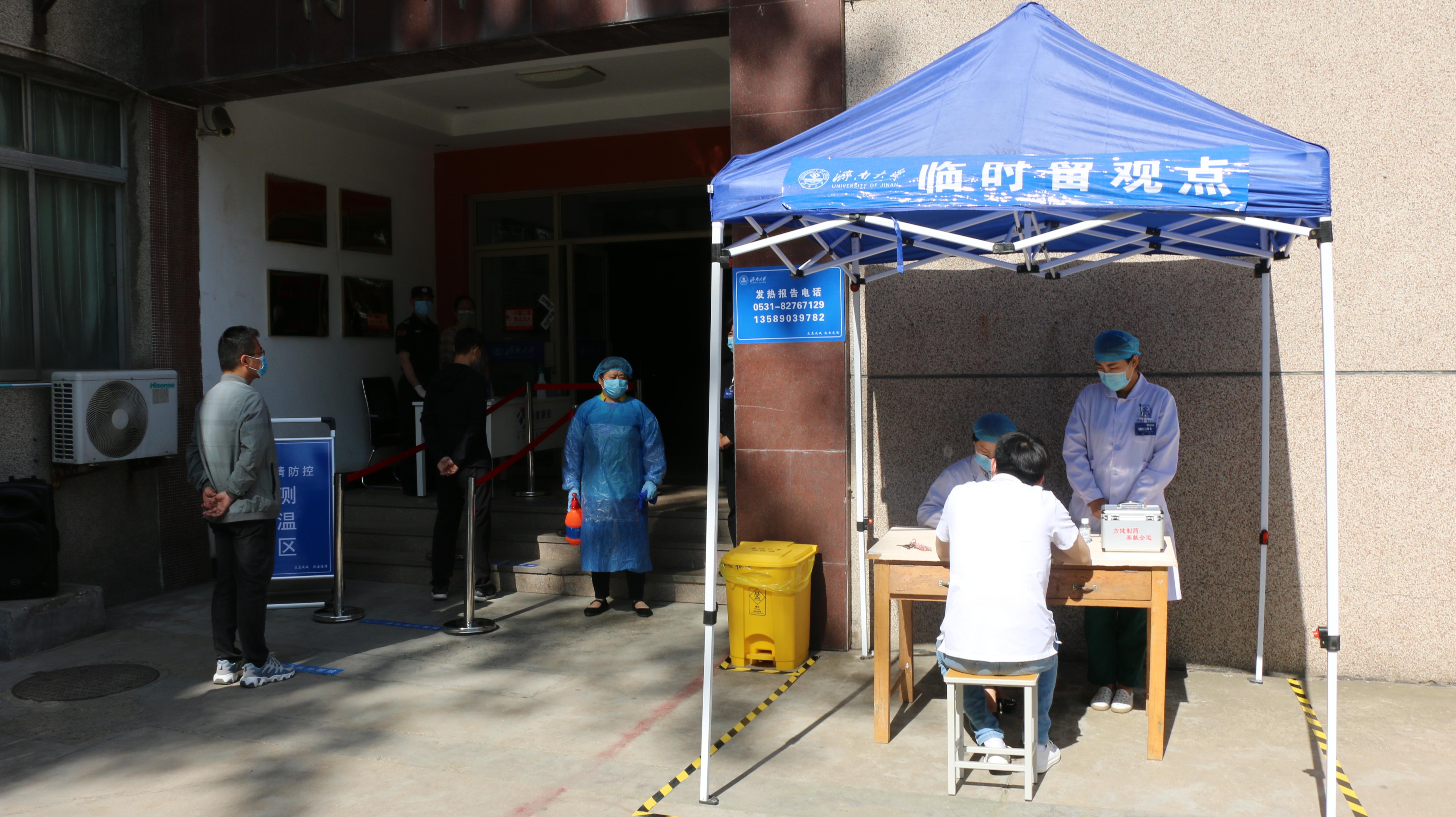 演练中,实战实操,注重效果。学院分别在第六教学楼入口处和实验室开展进入教学楼(办公楼)测温异常、实验室(教室)内学生自感异常等场景的模拟演练。演练过程严格按照演练方案进行,分工明确、迅速行动、协调配合、衔接紧密、紧张有序,覆盖了学生体温检测(自感异常)、维持秩序、立即上报、留观接诊、复测体温、上报学校、应急处置、确诊转送、引导疏散、全面消杀等环节,一系列工作紧锣密鼓、齐头并进,疫情防控应急演练圆满结束。