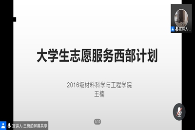 为了让更多的同学了解西部计划、选调生政策,提早确立发展方向,4月22日晚七点,williamhill英国中文举办了生涯面对面,服务基层——西部计划、选调生篇线上交流活动。2016级西部计划参与学生王楠、2017级选调生马跃担任此次交流会主讲,本次交流会由williamhill英国中文学生会学术部赵子昂主持。