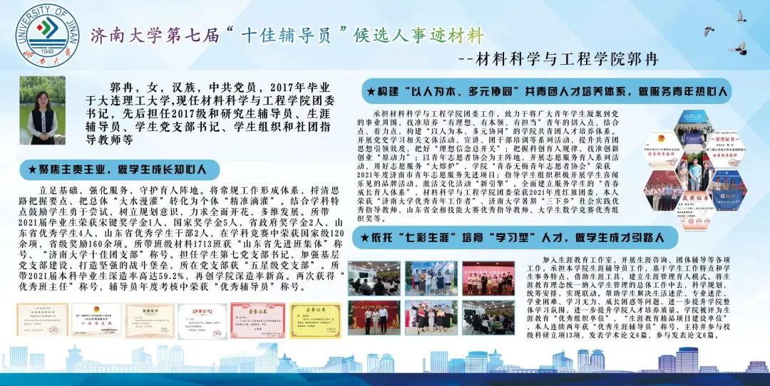 教育无他,唯爱与榜样。五年时间里主持科研立项4项,参与科研立项9项,参与并发表学术论文12篇,两次获得“优秀班主任”、获“优秀生涯辅导员”,连年获得暑期社会实践“优秀指导教师”,获”优秀青年工作者“等荣誉。所带2021届学生获120余项国家级奖项,150余项省级奖项,本科生深造率高达59.2%,涌现出13个考研宿舍。