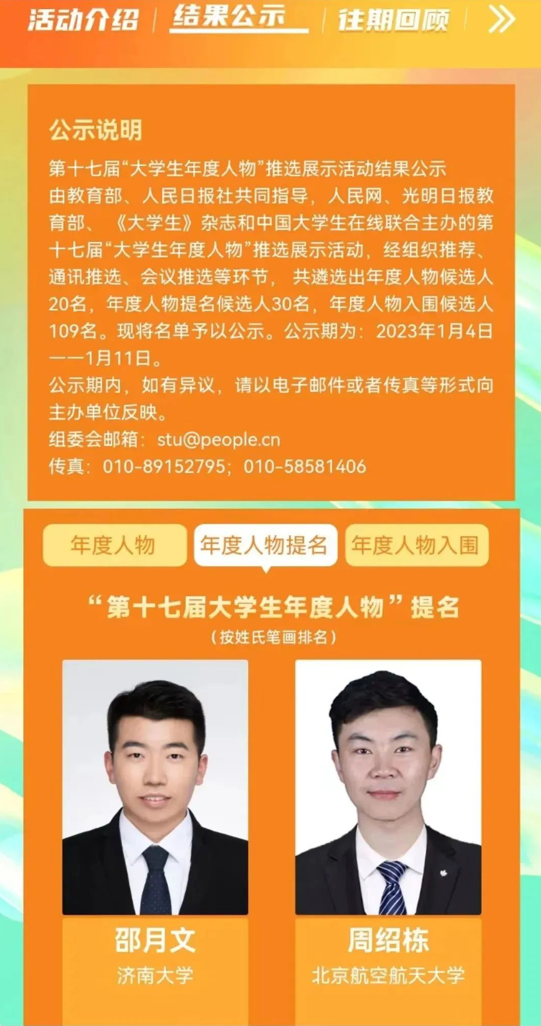 近日,由教育部、人民日报社共同指导,人民网、光明日报教育部、《大学生》杂志和中国大学生在线联合主办的第十七届“大学生年度人物”推选展示活动,经组织推荐、通讯推选、会议推选等环节, 共遴选出年度人物候选人20名,年度人物提名候选人30名,年度人物入围候选人109名。我院2020级博士生邵月文同学当选第十七届“大学生年度人物”提名候选人。