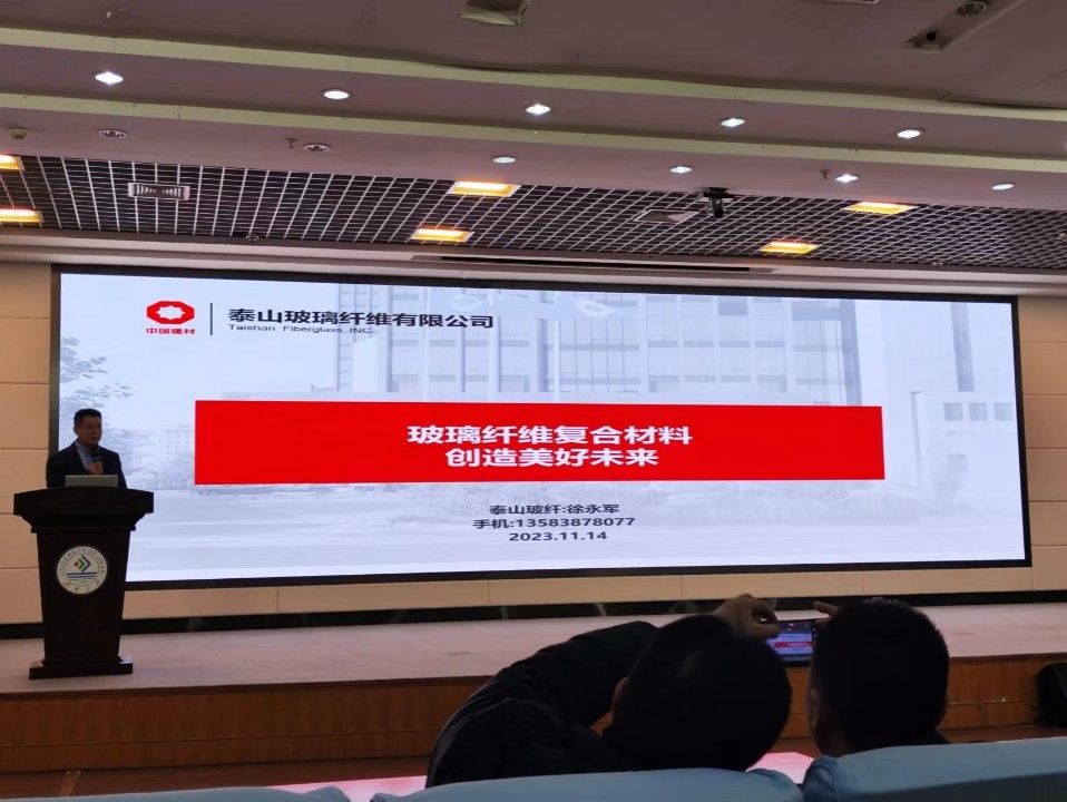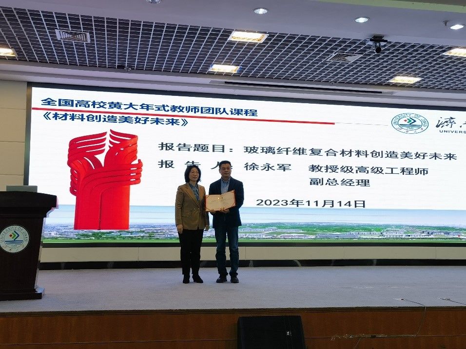 徐永军做了“玻纤复合材料创造美好未来”的专题报告。他结合自身研发经历从“泰山玻璃纤维有限公司发展历程、玻璃纤维高端生产工艺、玻璃纤维复合材料产品及应用”等三个方面详细讲解了泰山玻璃纤维有限公司主导优势产品,玻璃纤维复合材料的研究动态与发展趋势,重点介绍了现行玻璃纤维复合材料高端应用场景及生产工艺特色。讲座报告内容丰富、集专业性与科普性于一身,受到广大师生一致好评。徐永军还与师生们进行了互动交流,现场气氛热烈。