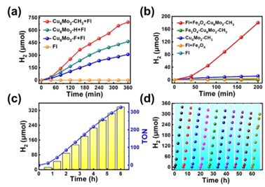 图2 (a)铜-钼双金属簇作为均相催化剂的光催化产氢活性;(b)不同材料的光催化产氢活性对比;(c)Fe3O4-Cu6Mo2-CH3的非均相光催化产氢活性;(d)循环稳定性测试