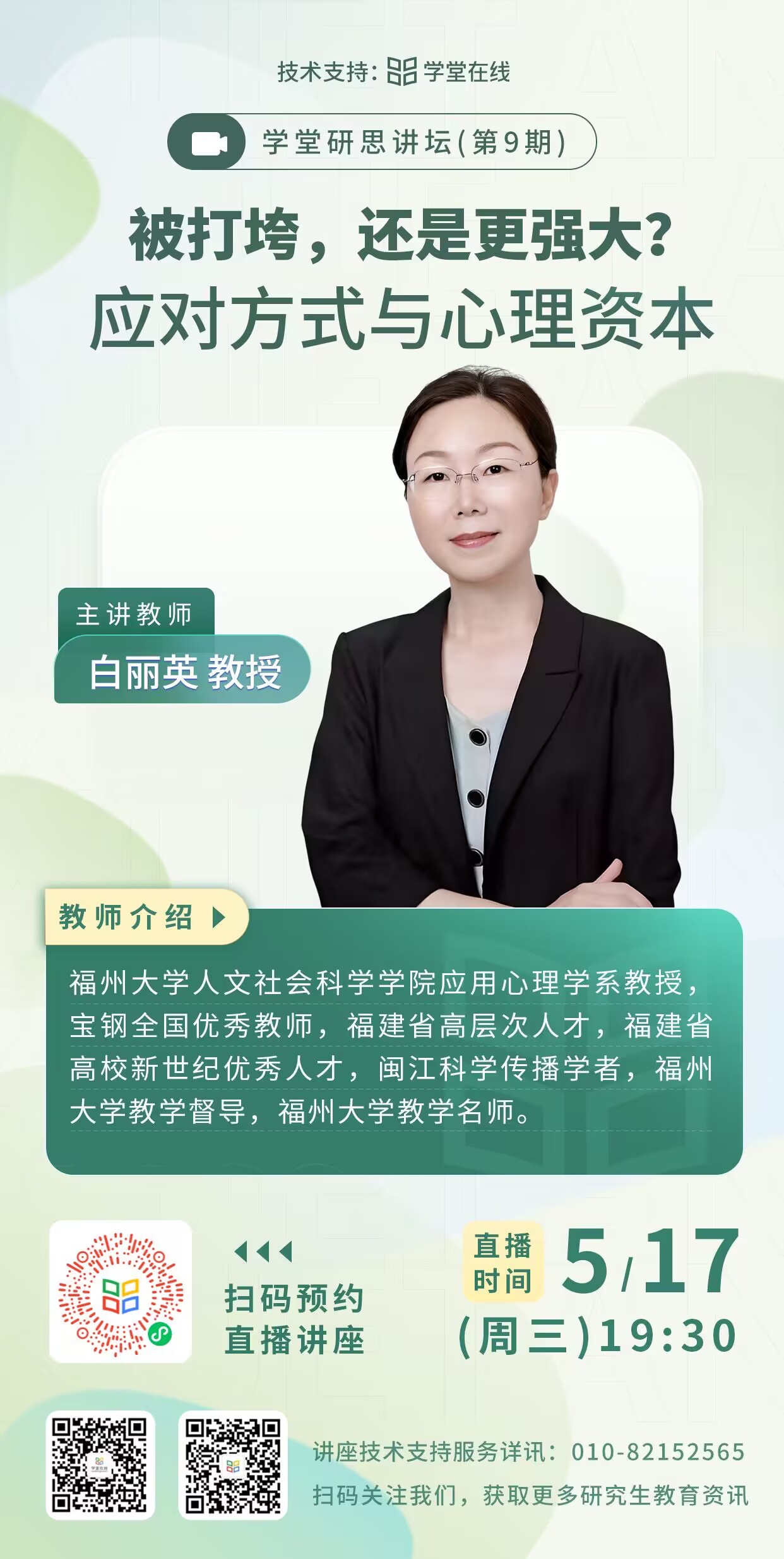 5月17日,学堂在线邀请到福州大学白丽英教授,将带来“被打垮,还是更强大?应对方式与心理资本”精彩直播讲座,与大家一起探索其中的心理机制。一、直播时间2023年5月17日(周三)19:30二、直播主题被打垮,还是更强大?应对方式与心理资本三、主讲嘉宾白丽英 教授福州大学人文社会科学学院应用心理学系教授,宝钢全国优秀教师,福建省高层次人才,福建省高校新世纪优秀人才,闽江科学传播学者,福州大学教学督导,福州大学教学名师。四、观看方式扫描下方海报中的二维码即可预约直播讲座
