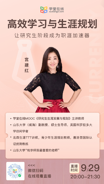 扫码加入直播或者登陆学堂在线官网(xuetangx.com) 搜索“高效学习与生涯规划——让研究生阶段成为职涯加速器”即可实时观看与回看,欢迎各位老师、同学参与!